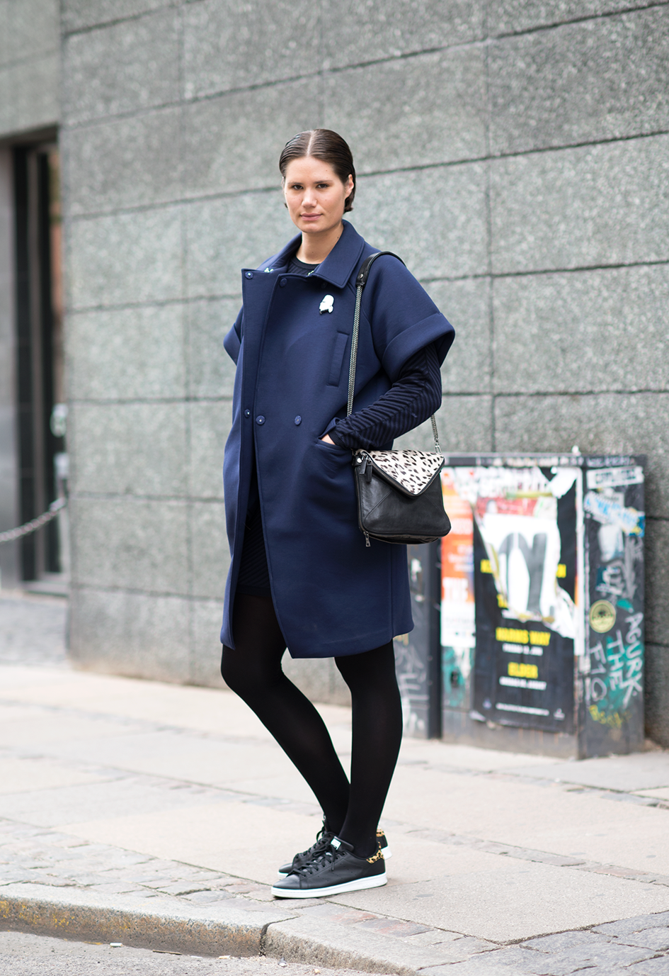 Captured under Copenhagen Fashion Week on Vogue.nl wearing Zara pants, Adidas sneakers, Valentino bag, Baum und Pferdgarten coat and sweater.