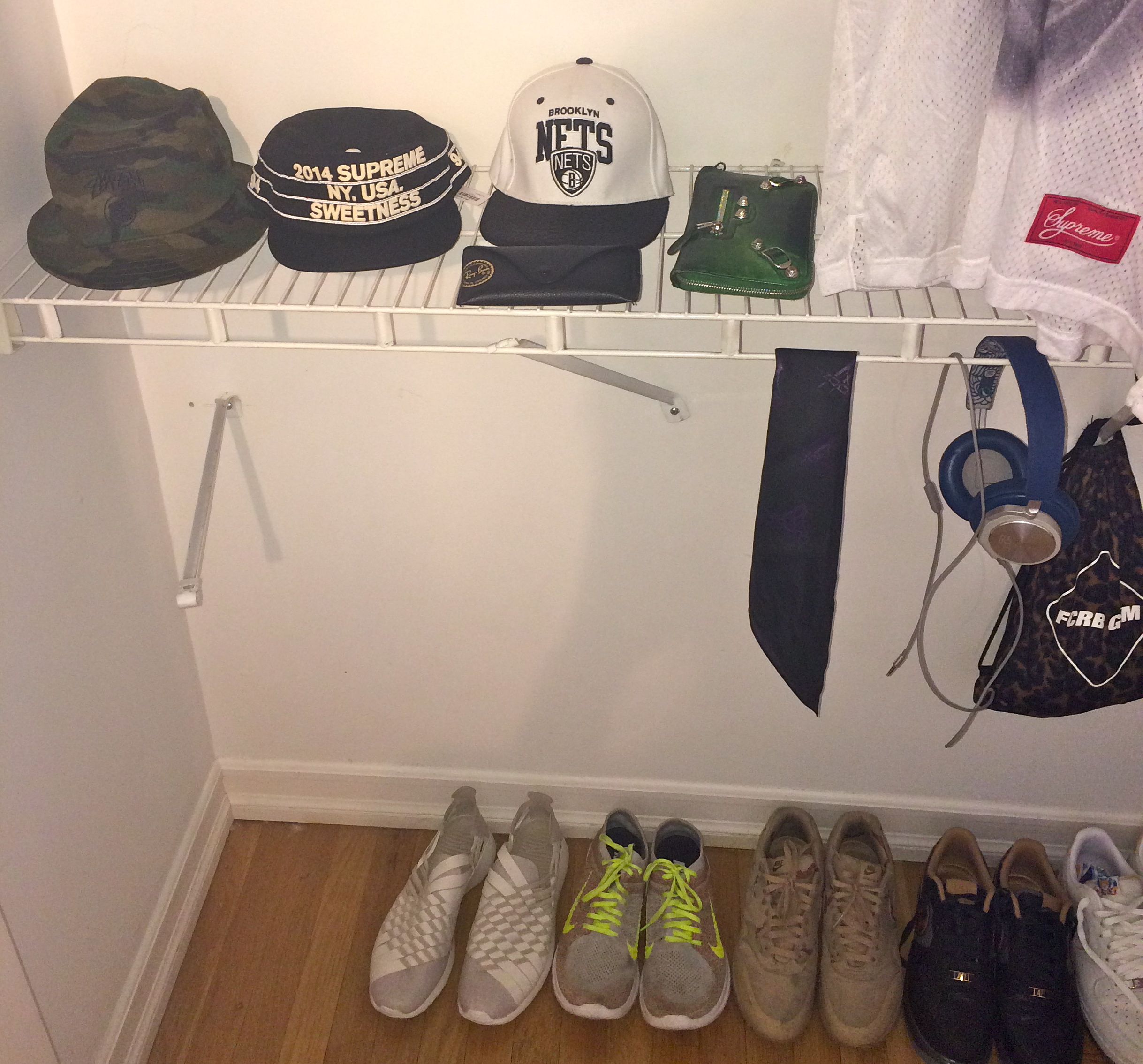 B&O X Pepsi headphones, Bucket hat from Stussy, Shoes from NIKE, Supreme + NETS cap, Balenciga wallet, Rayban sunglasses, NIKE Zoom Relay headband.